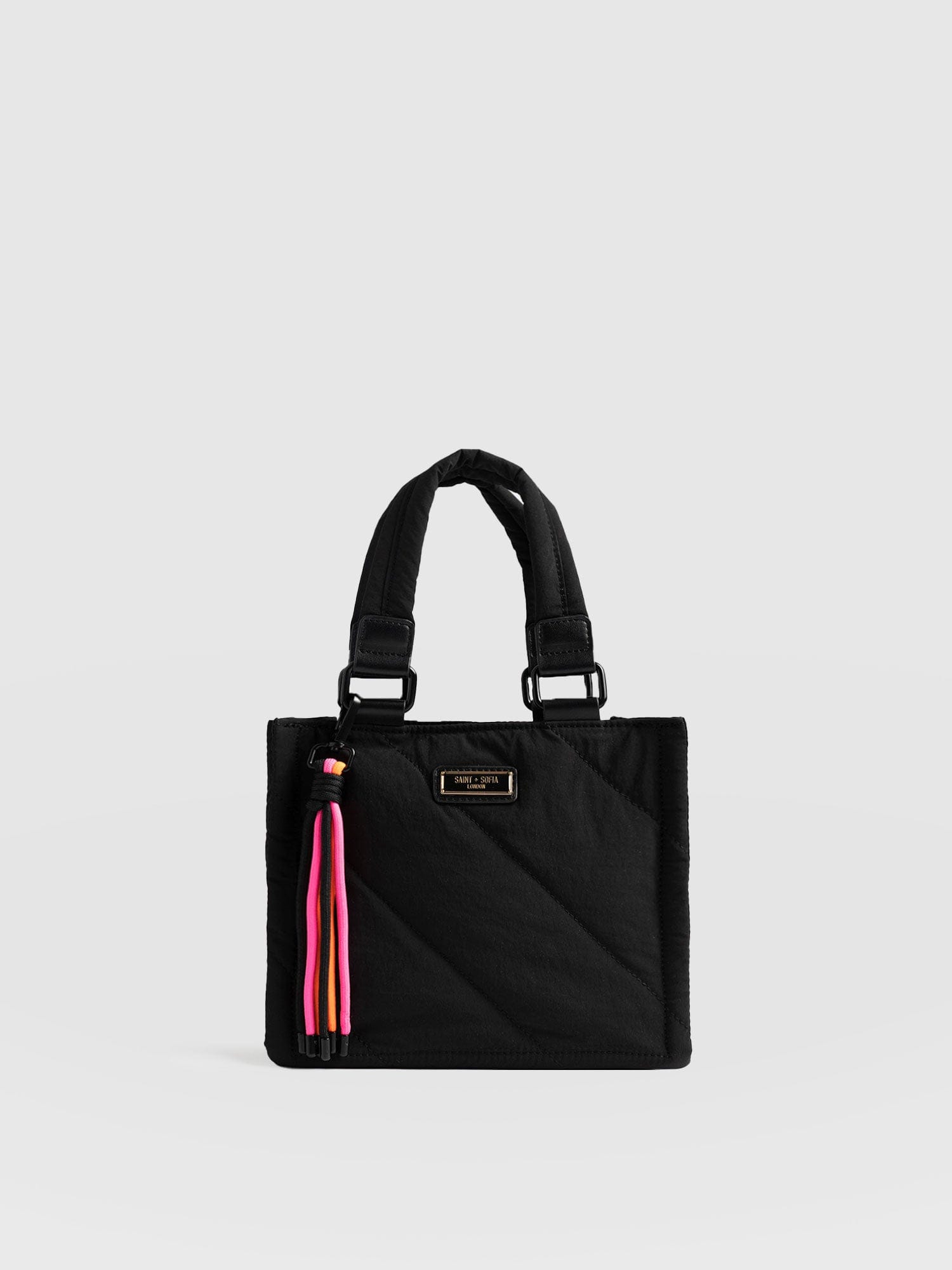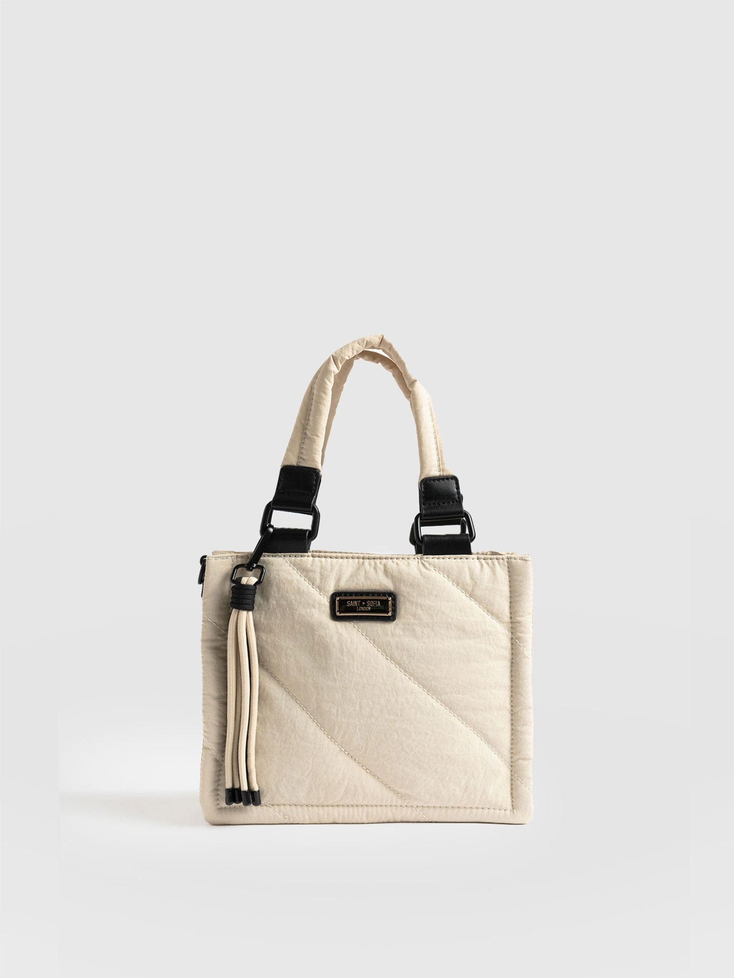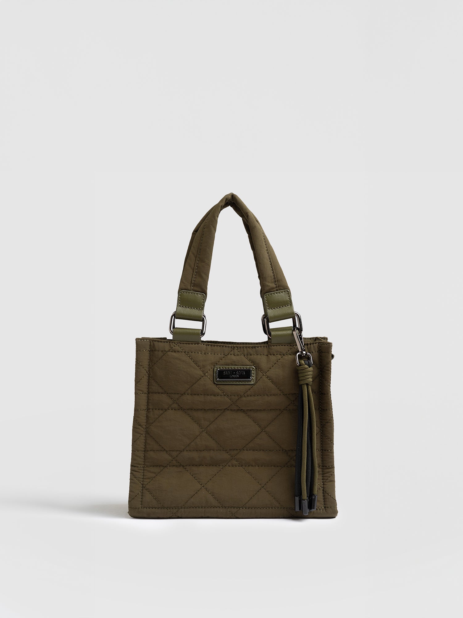 A beautiful, easy-to-use tote bag in khaki, the Mini Penny is constructed from quilted nylon to a classic square shape with double top handles. Perfect for everyday wear, it's embellished with a branded Saint and Sofia plaque at the front and a pure leather trim for subtle elegance. What’s more, this bag features a removable keyring with tonal cords for a playful finish. Add the detachable crossbody strap for ease, or remove it for a chic hand-held bag.