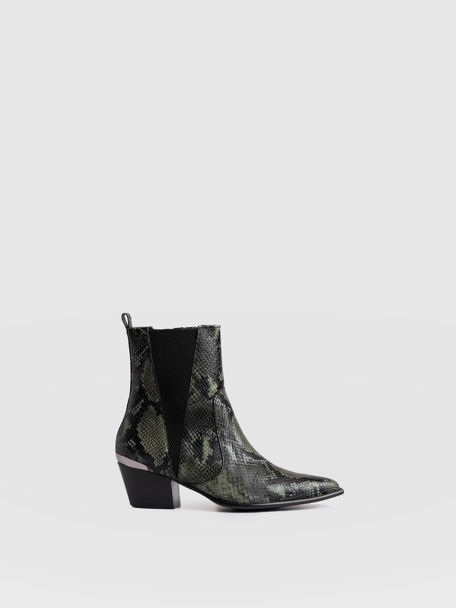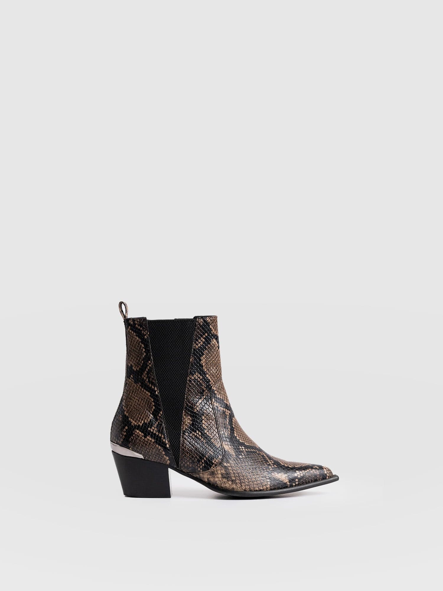 Stride with confidence and stomp with a serpentine edge in our new Billie Snake Boots. This statement pair is masterfully sculpted by hand using Portuguese leather and decorated with a snake-embossed texture for a safari-inspired edge. At the back, a glossy cap adds an elegant shine, while a small heel helps to elongate your frame. Slip yours on to dress up casual outfits or as a finishing touch to evening ensembles.