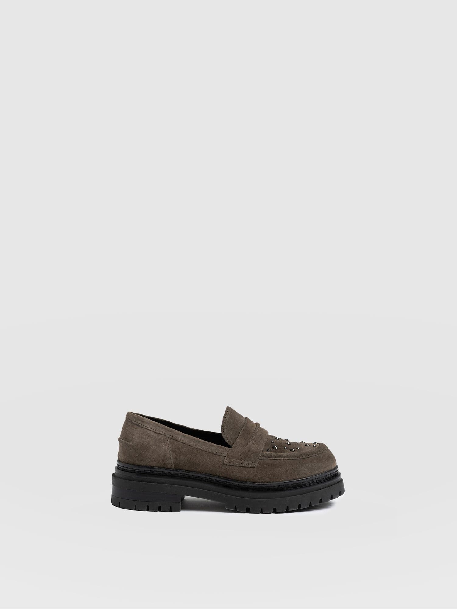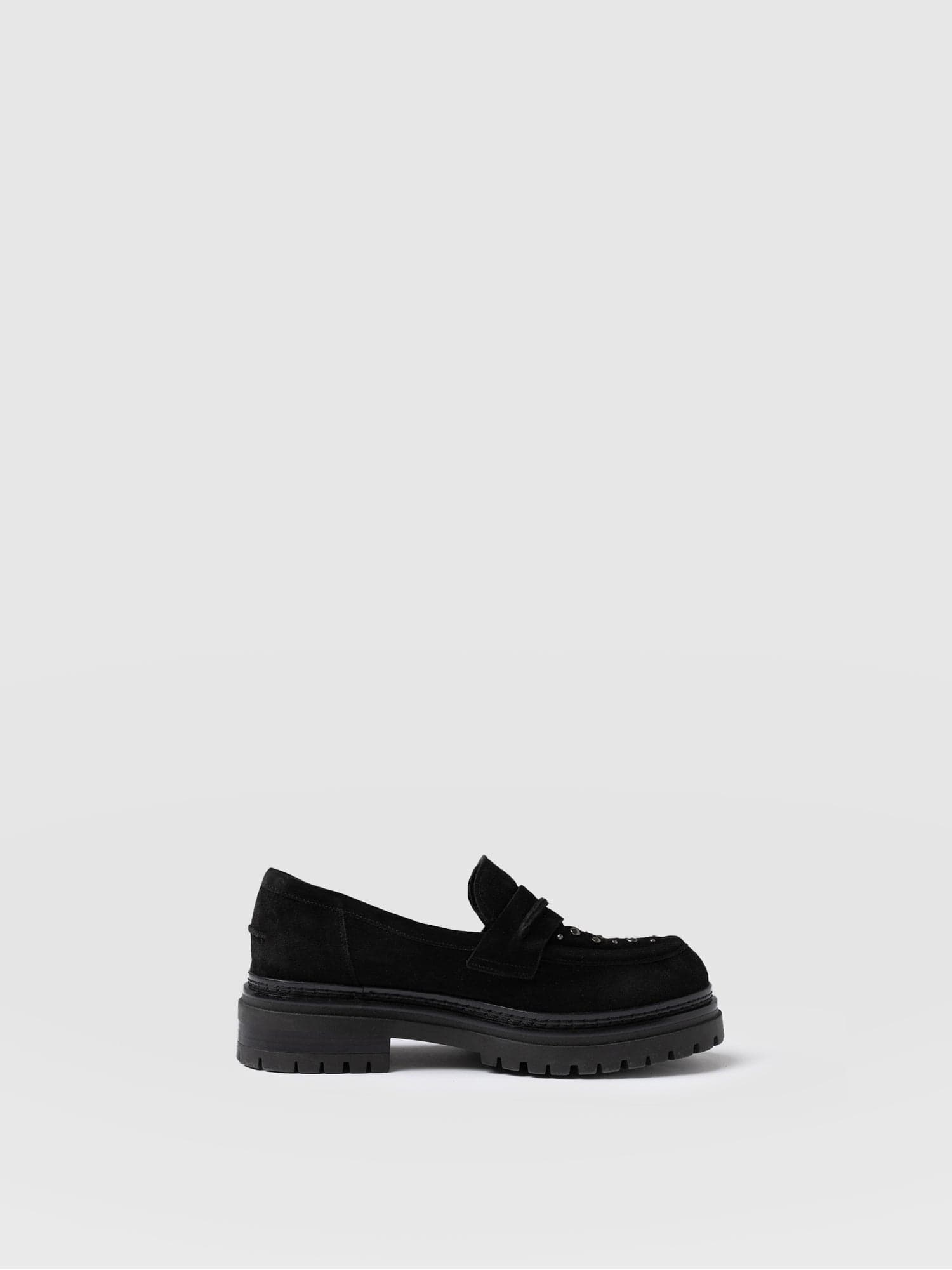 Handmade in Italy using the finest suede, the Raine Loafers in black are a classic pair to add to any wardrobe. Their chunky sole makes them perfect for creating looks with attitude, while the soft feel provides instantly comfortable wear. Plus, the hexagonal stud details that glitter the front help to add a touch of sparkle to everyday styles. Slip into them with jeans, skirts, or dresses – the choice is yours.
